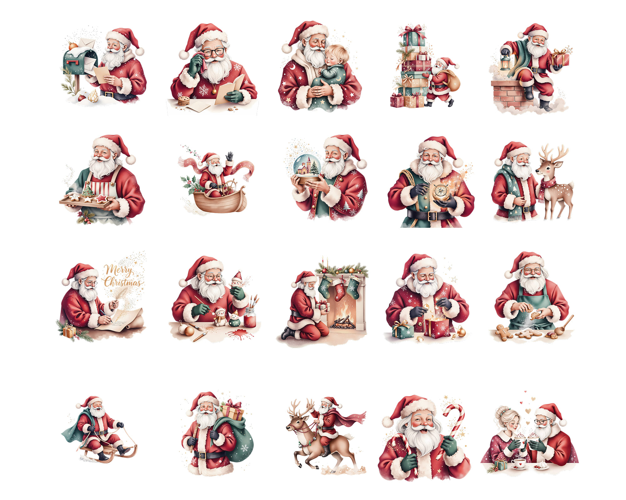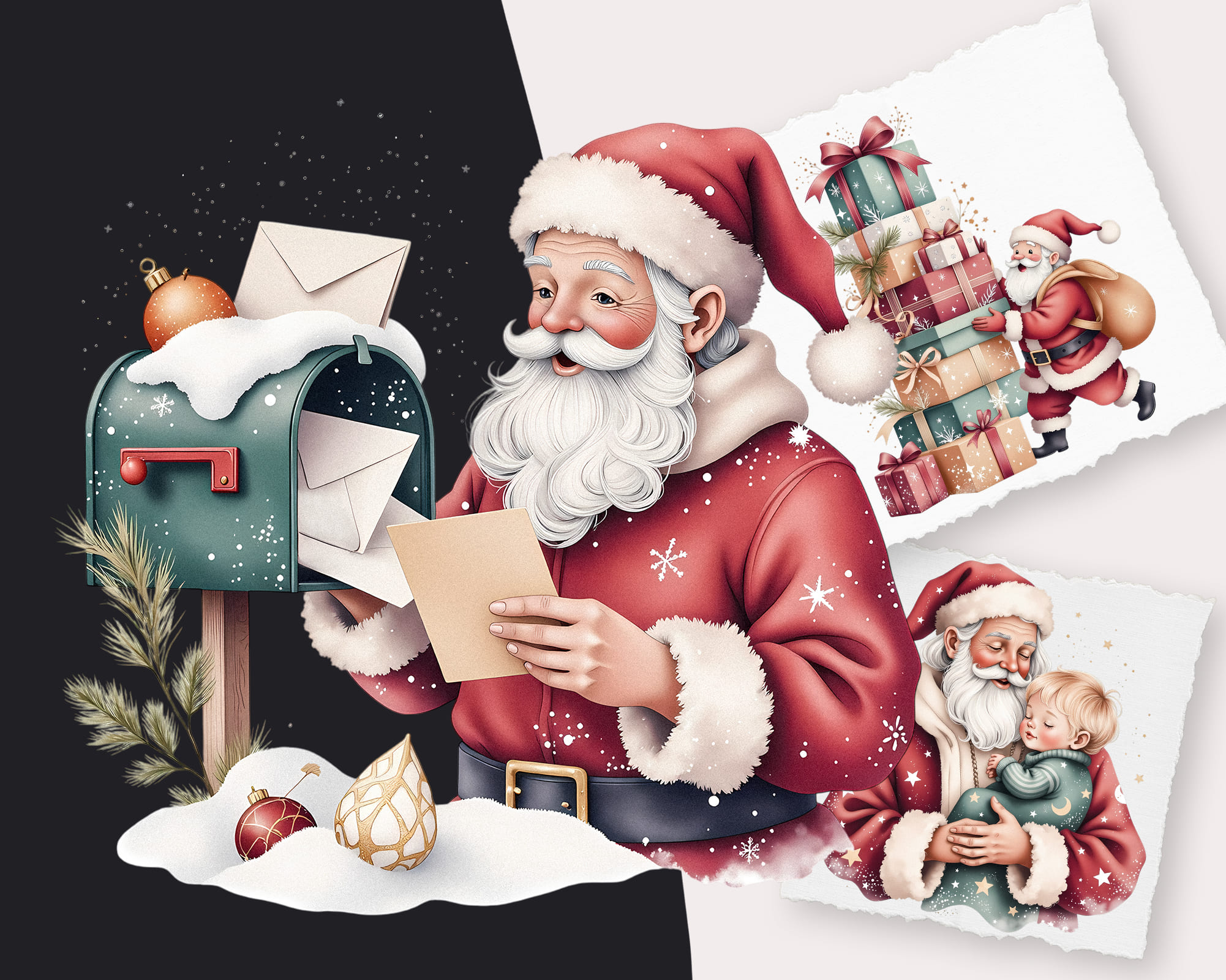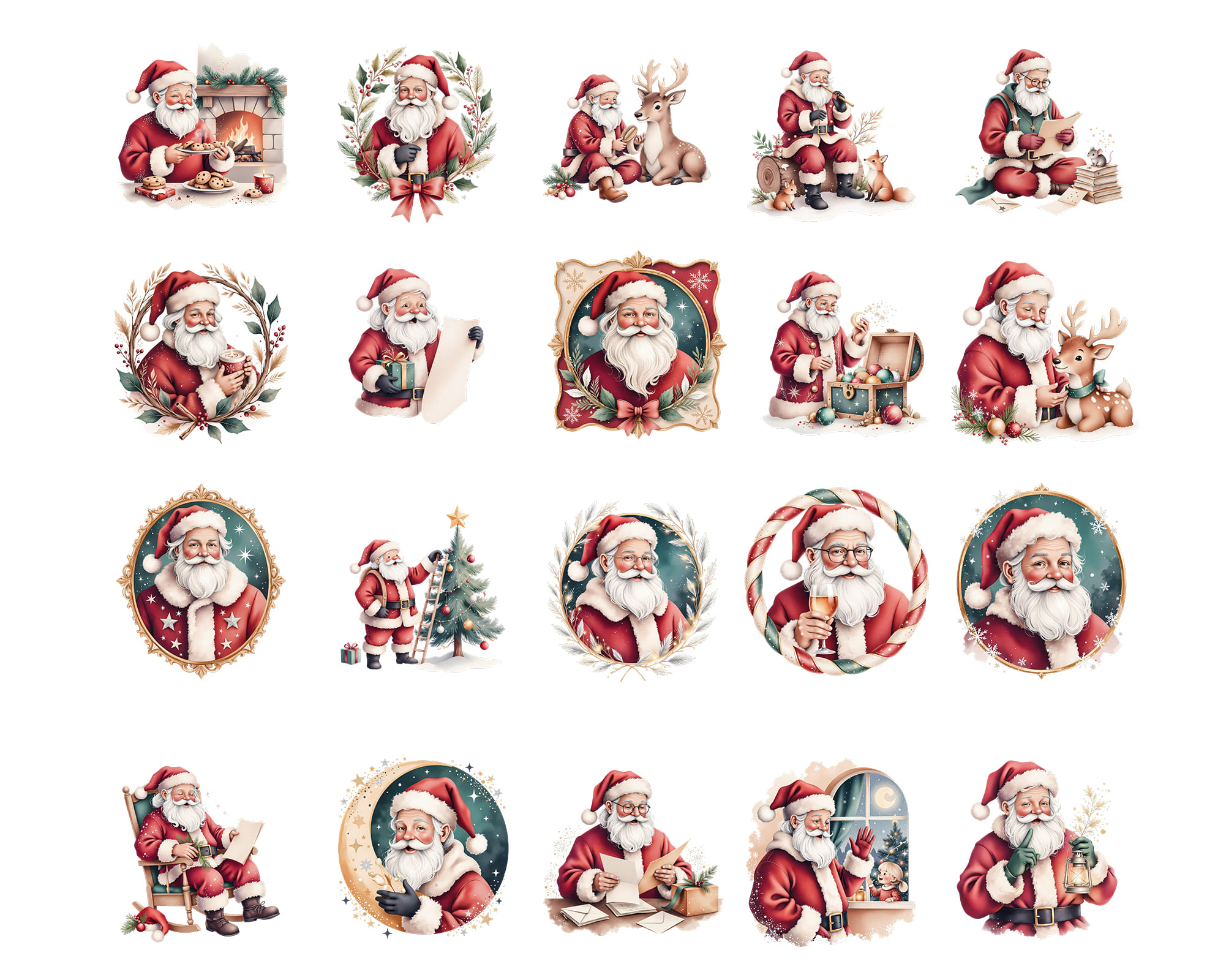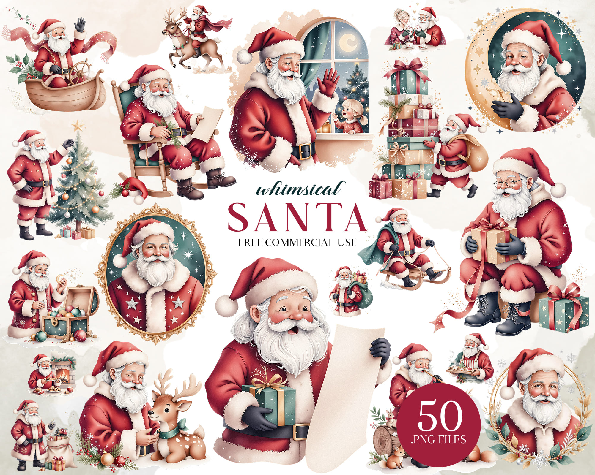 A charming Whimsical Santa clipart bundle featuring 50 festive PNG illustrations of Santa in magical holiday scenes. This set includes Santa reading letters, packing gifts, decorating the tree, flying with reindeer, holding toys and posing in vintage frames and cozy vignettes. Perfect for Christmas cards, tags, planners, stickers, sublimation, wrapping paper, and nostalgic holiday branding. All graphics are provided as high‑quality transparent PNG files.