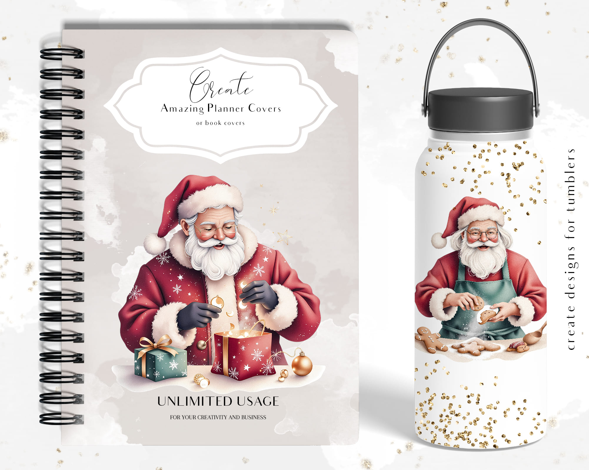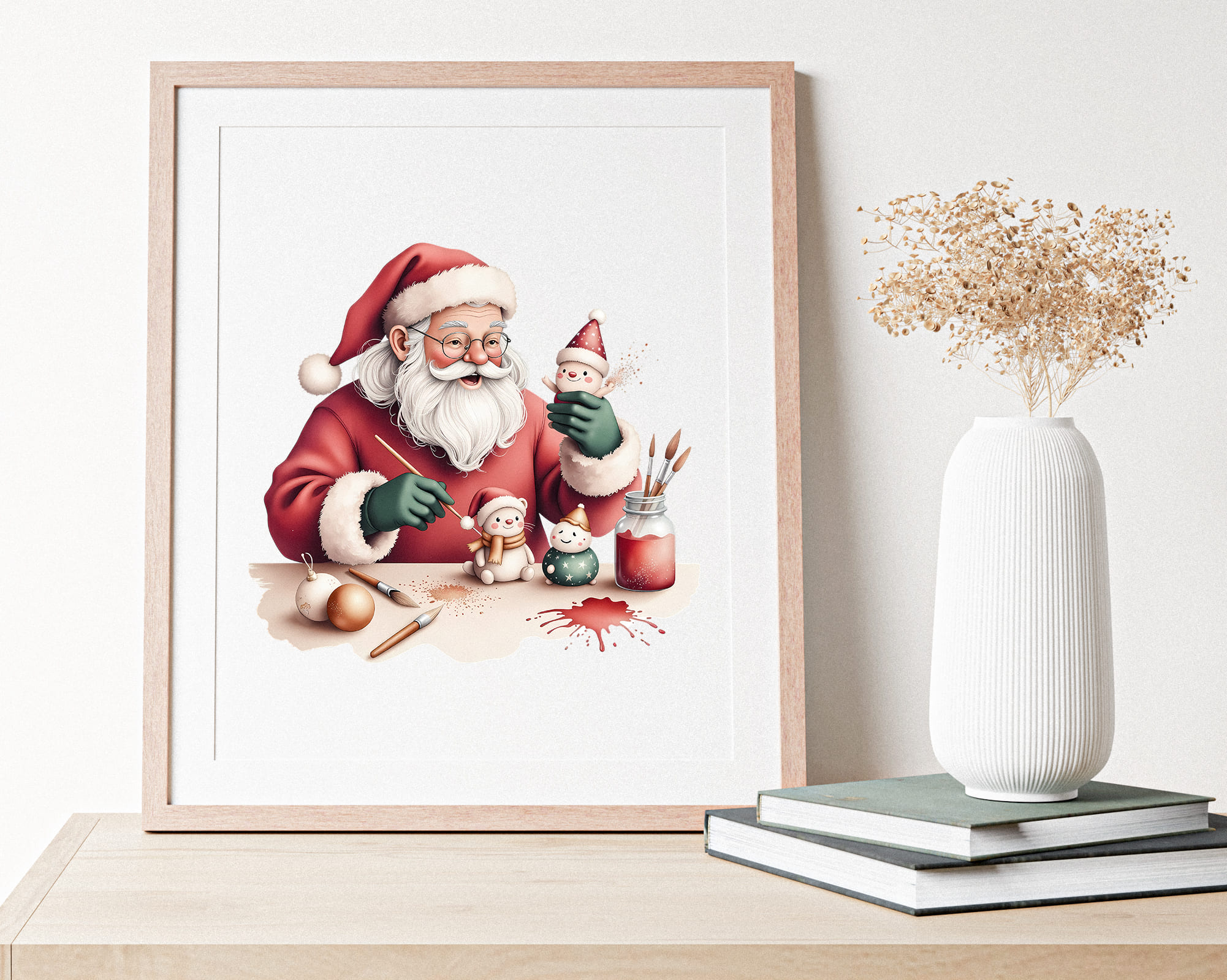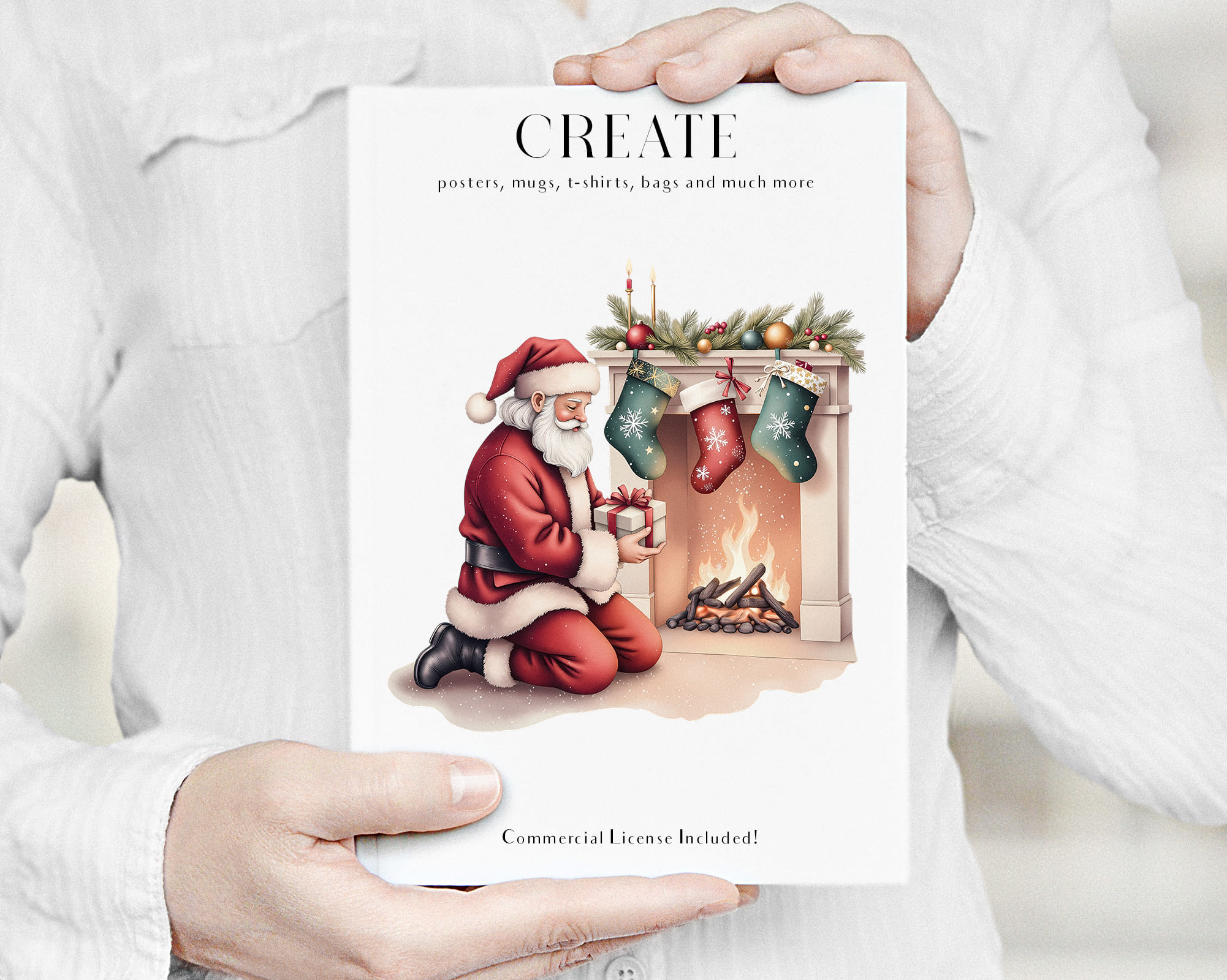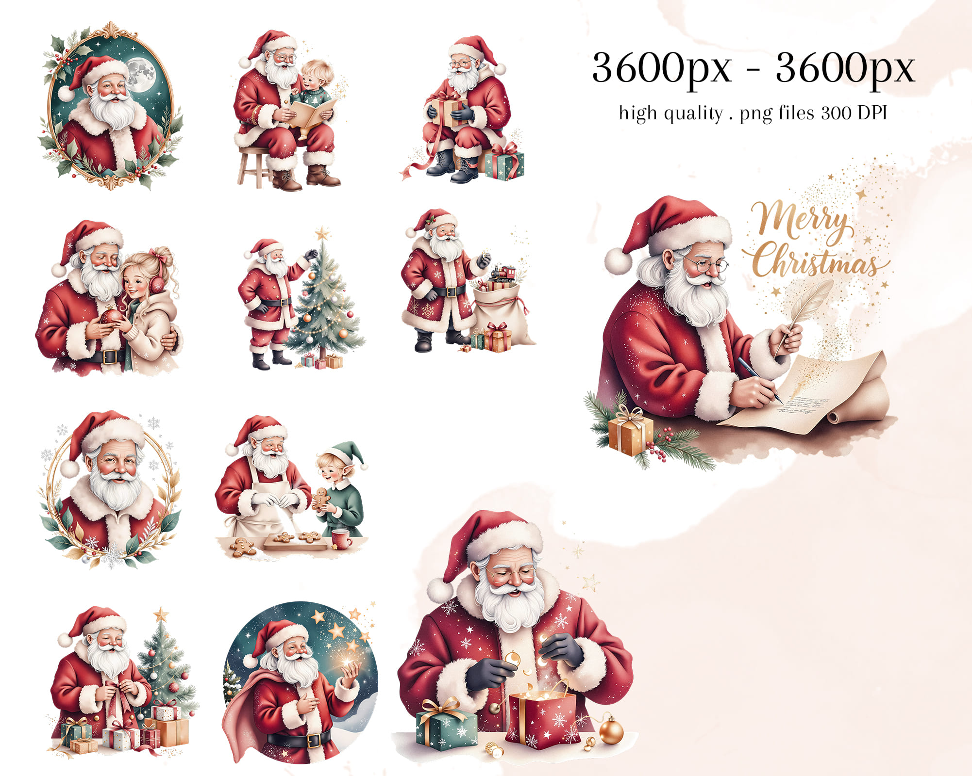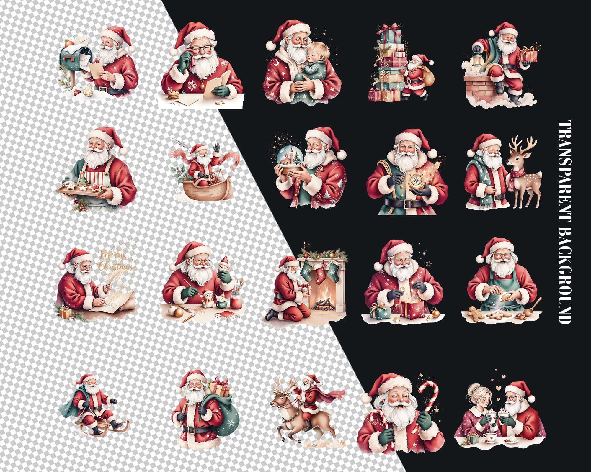 A charming Whimsical Santa clipart bundle featuring 50 festive PNG illustrations of Santa in magical holiday scenes. This set includes Santa reading letters, packing gifts, decorating the tree, flying with reindeer, holding toys and posing in vintage frames and cozy vignettes. Perfect for Christmas cards, tags, planners, stickers, sublimation, wrapping paper, and nostalgic holiday branding. All graphics are provided as high‑quality transparent PNG files.