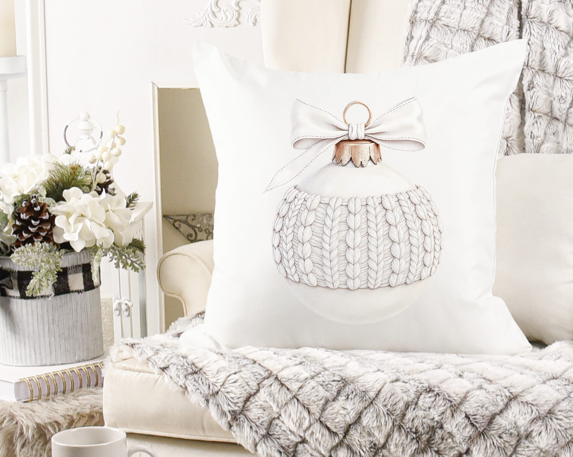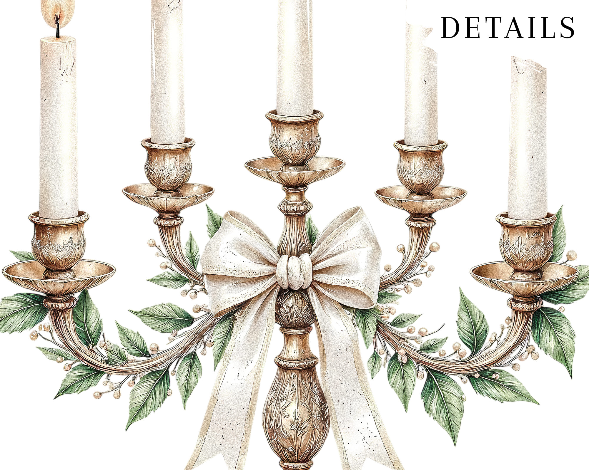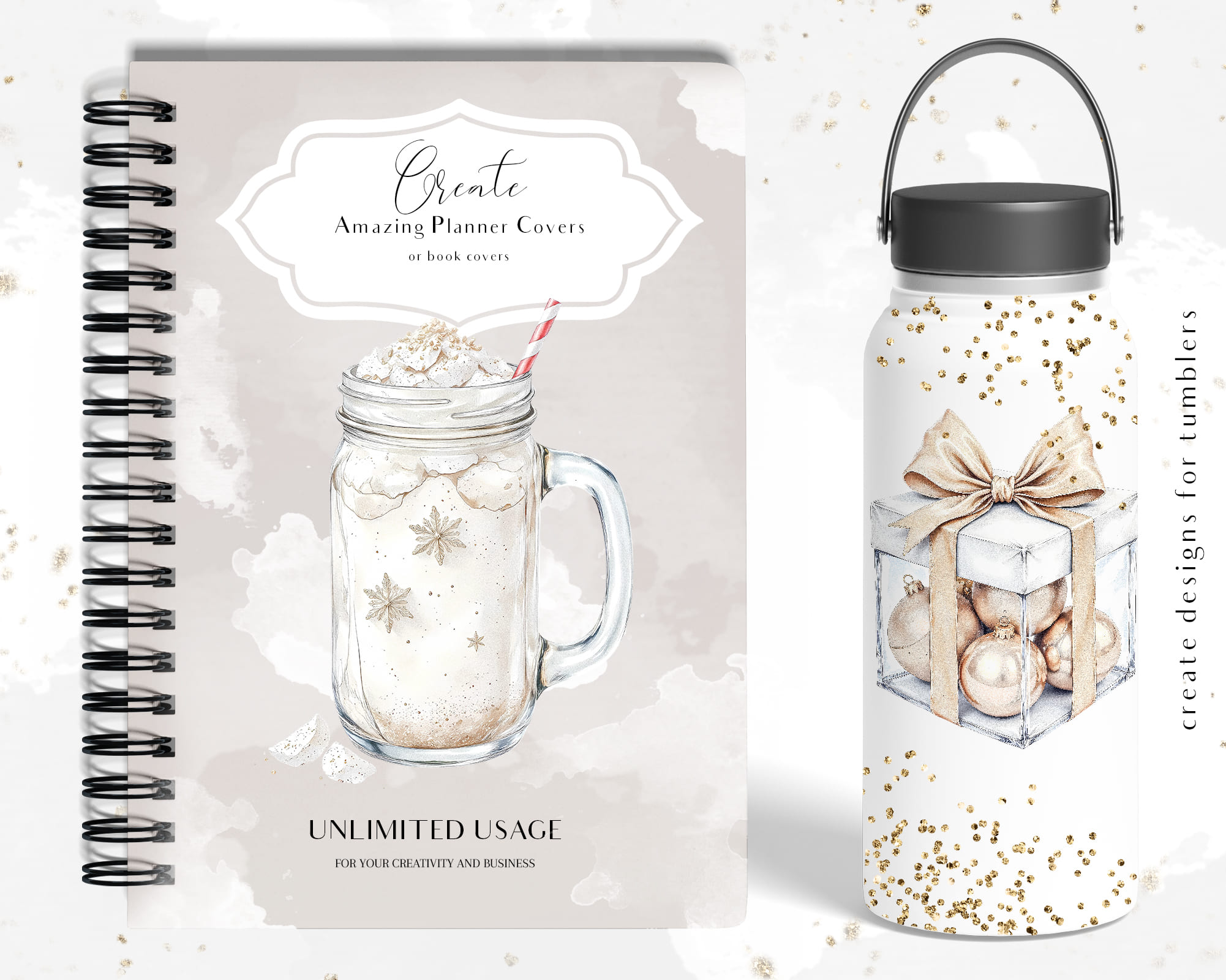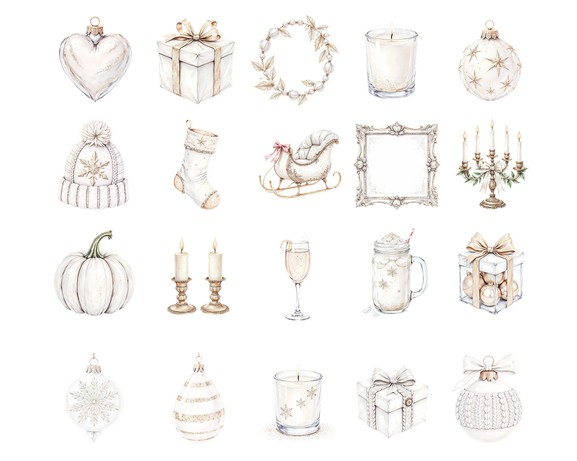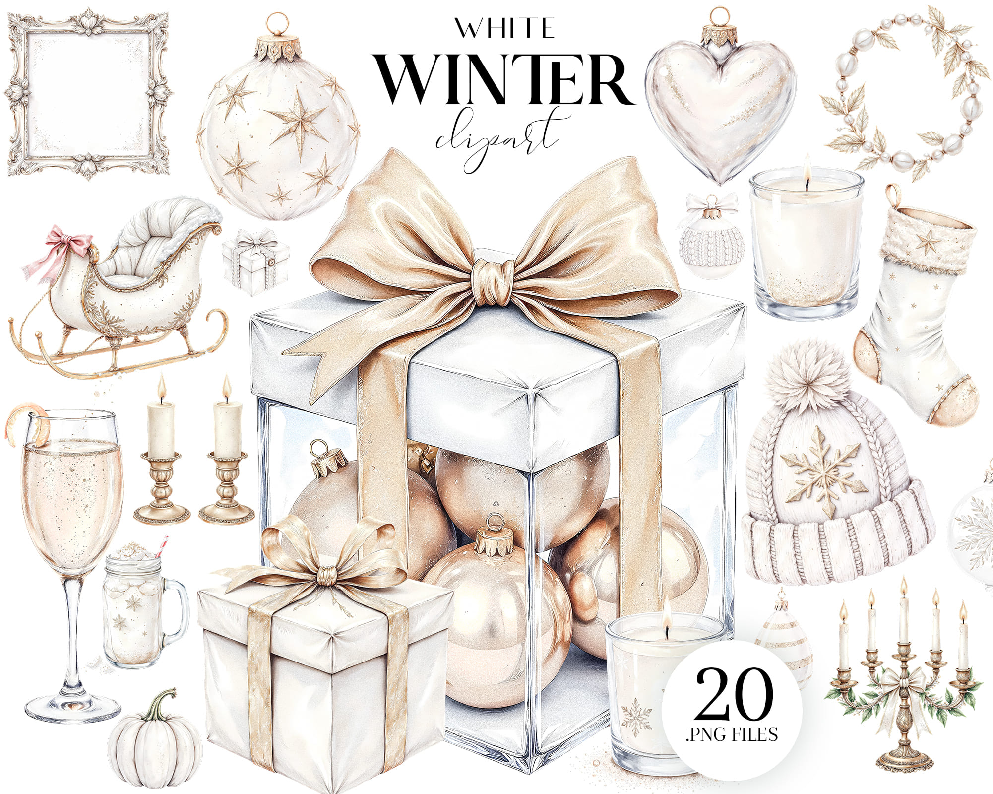 White Winter Clipart includes 20 elegant PNG illustrations in soft white and gold tones. Transparent backgrounds, 300 DPI resolution.