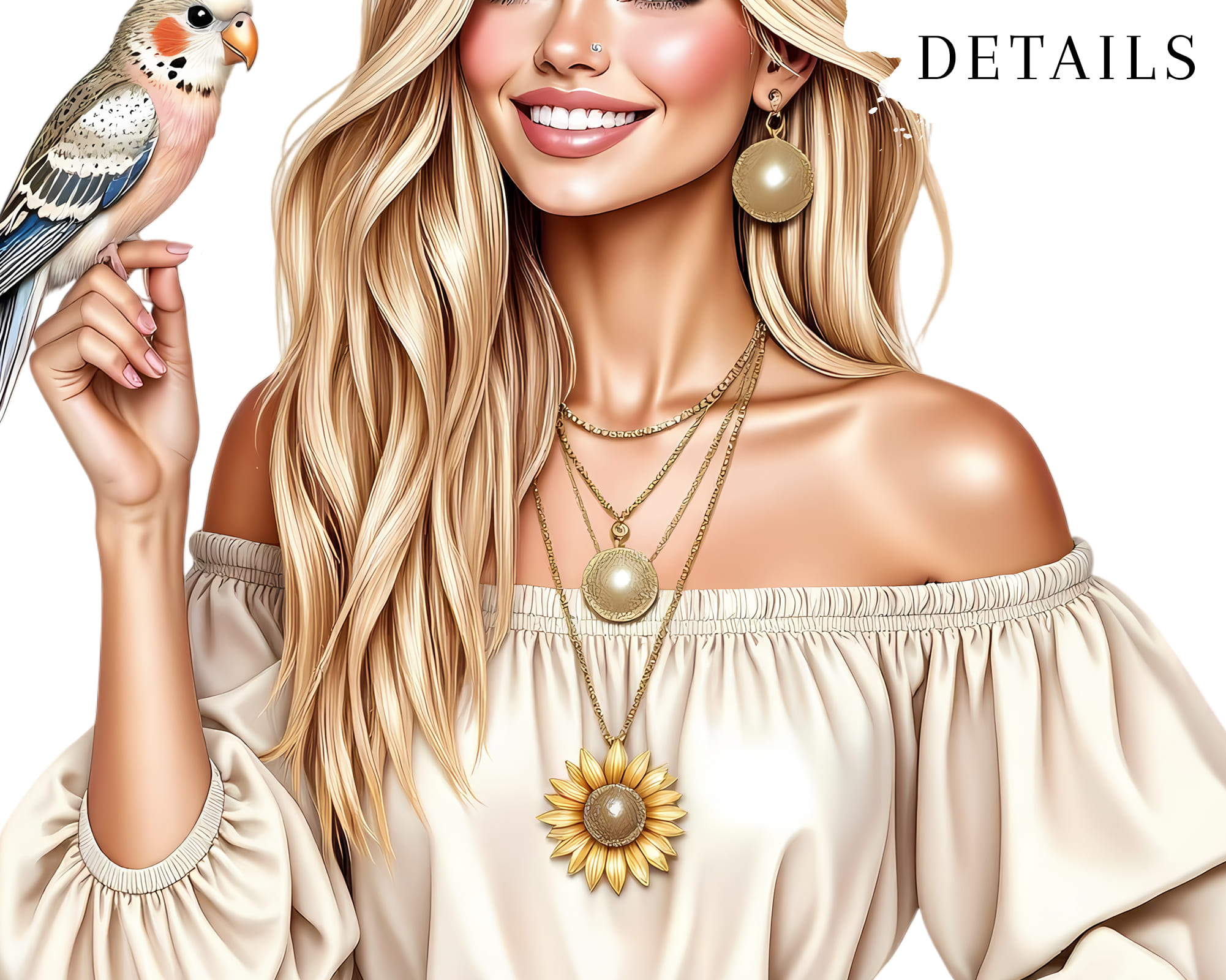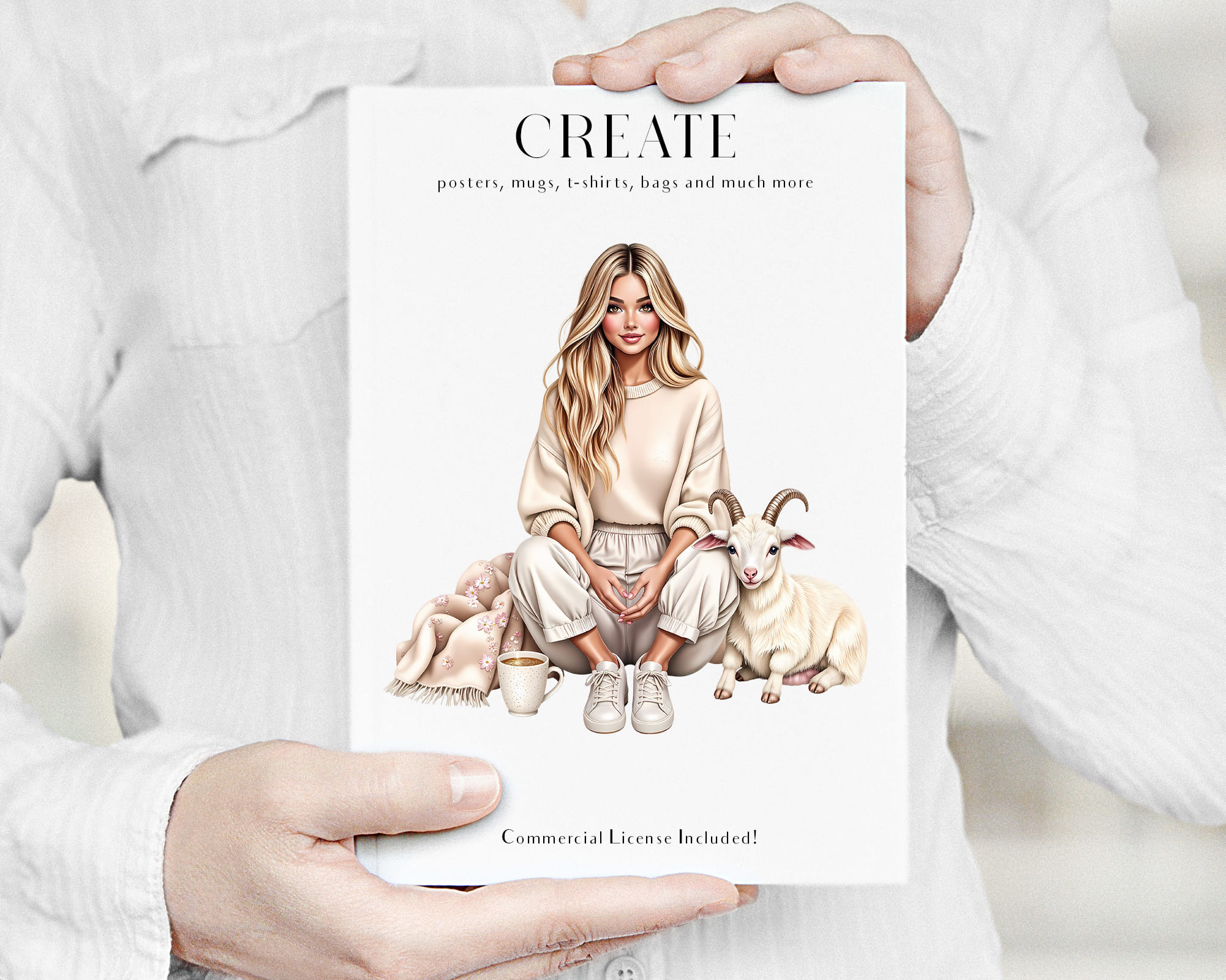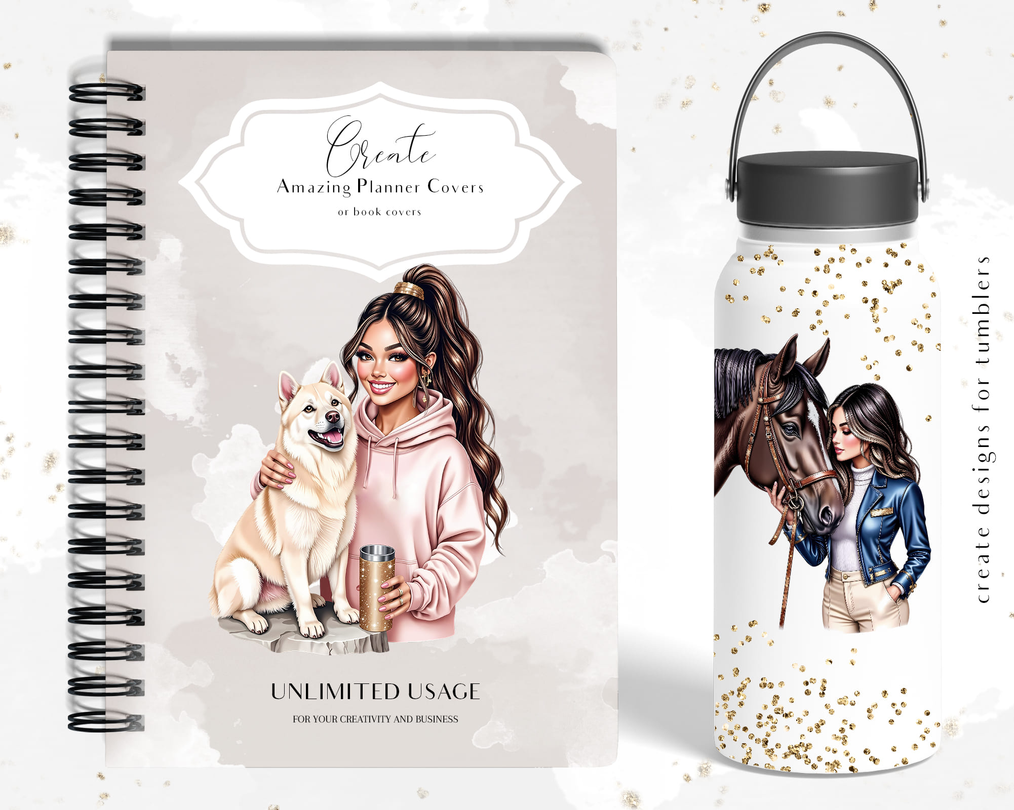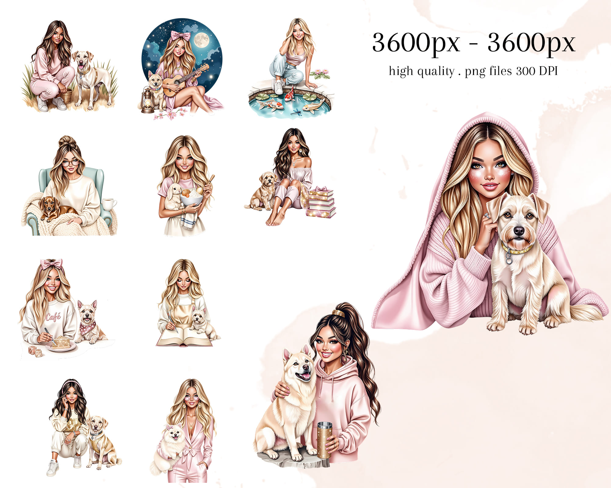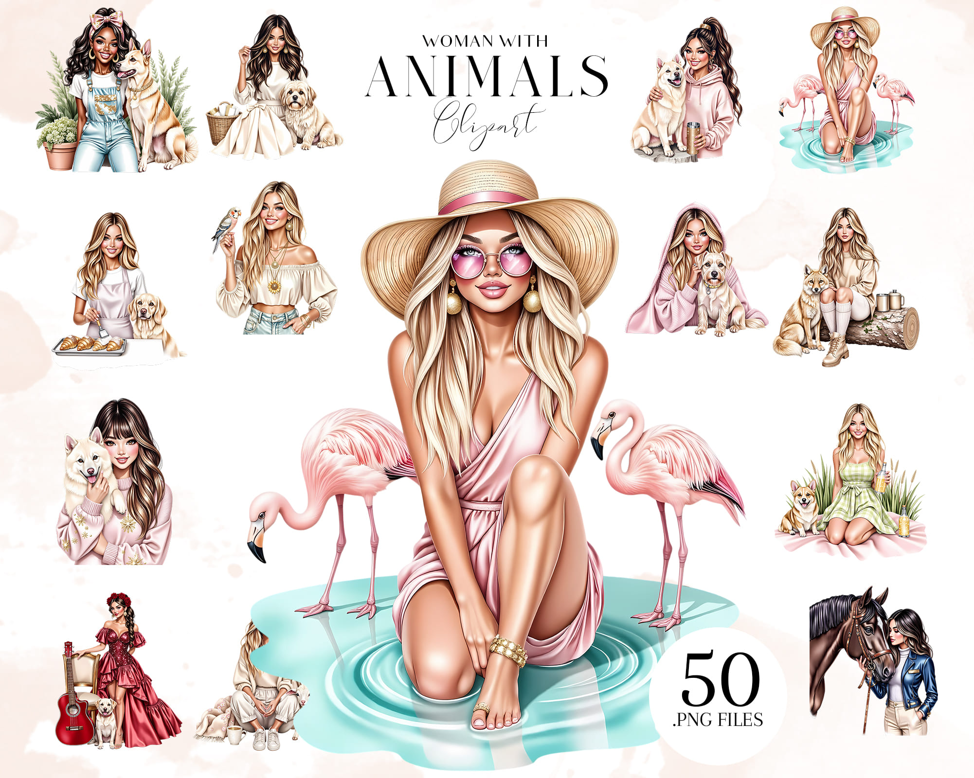 Celebrate friendship and nature with this Woman with Animals Clipart set 🌿. Perfect for lifestyle branding, cards, stickers, and planners. Includes 50 PNG files with transparent backgrounds.