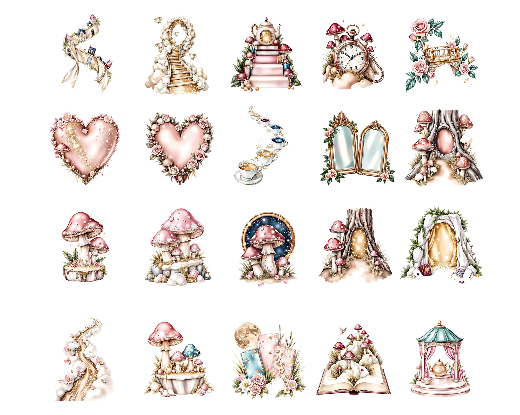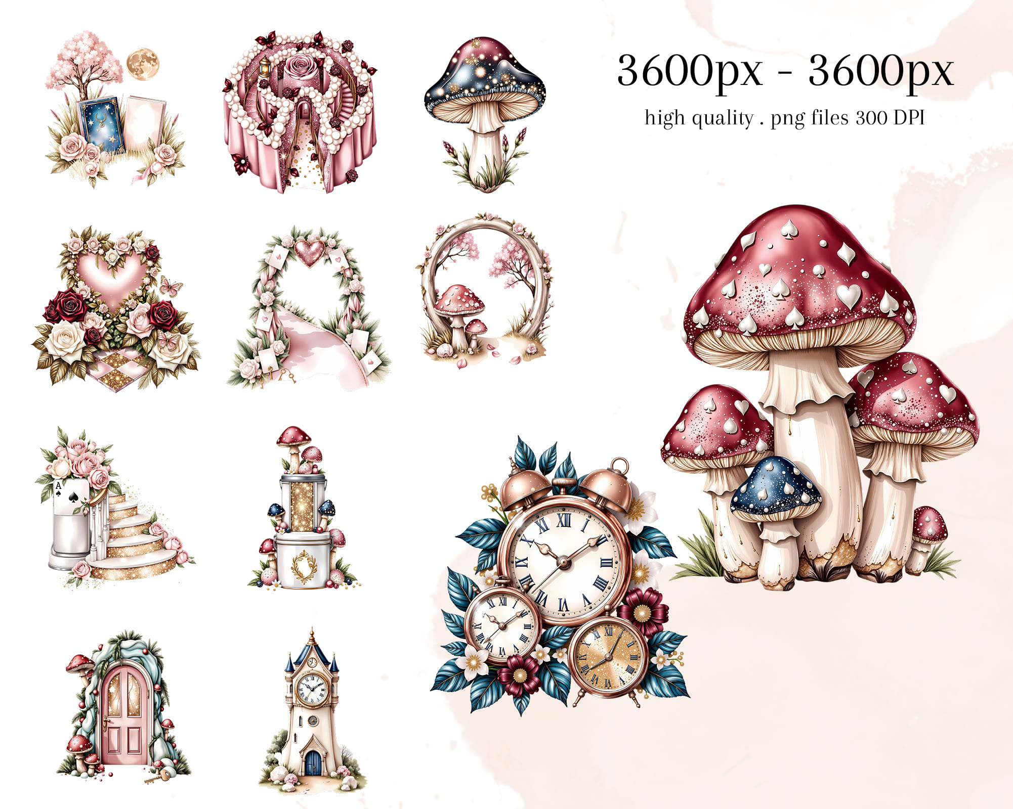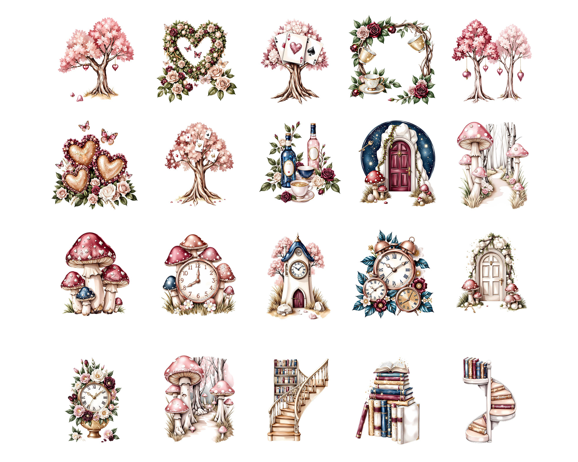 Create enchanting scenes with these elegant Wonderland Backgrounds 🌷. Featuring floral clocks, trees, hearts, and fairy doors — perfect for journaling, cards, and invitations. Includes 50 PNG files.