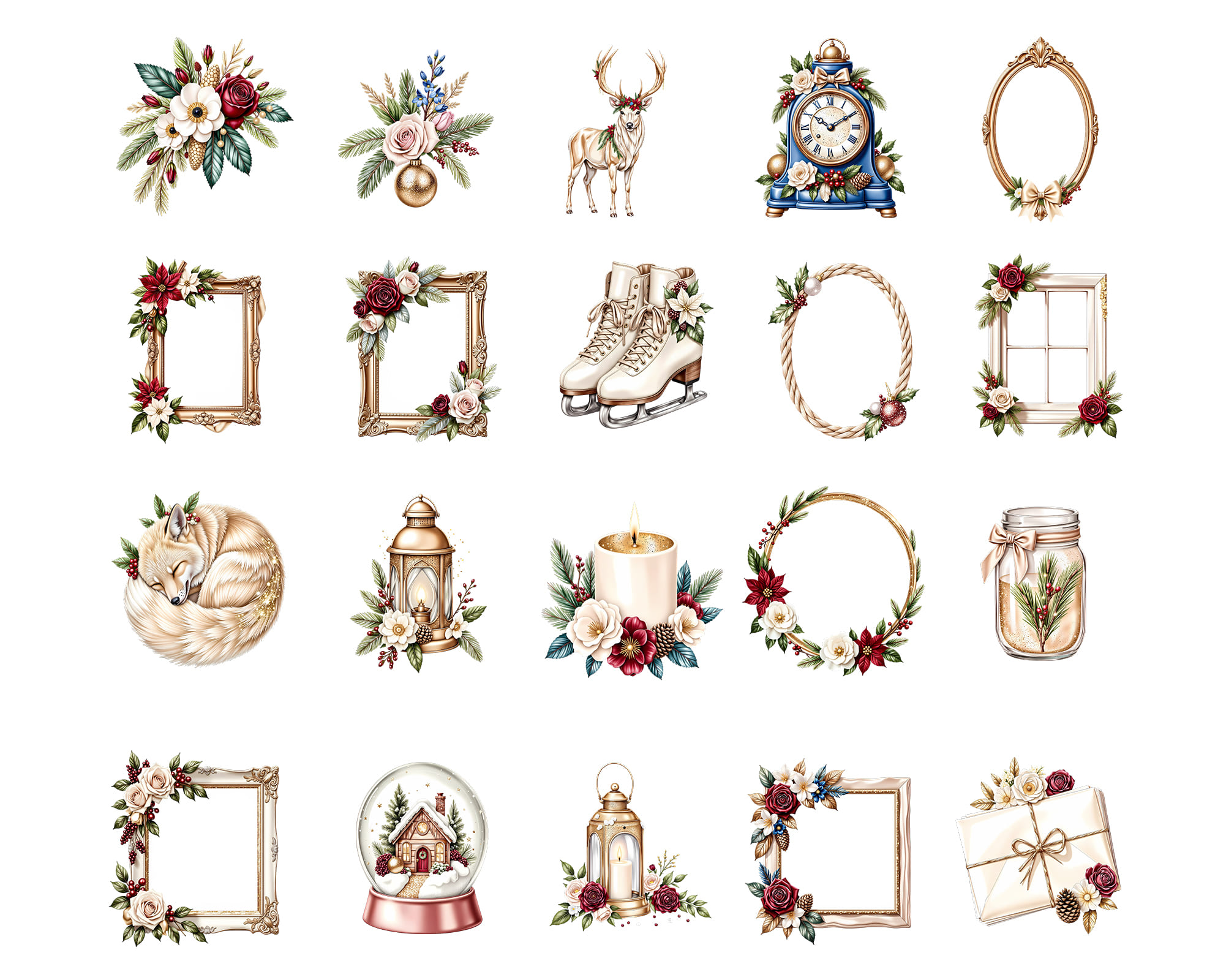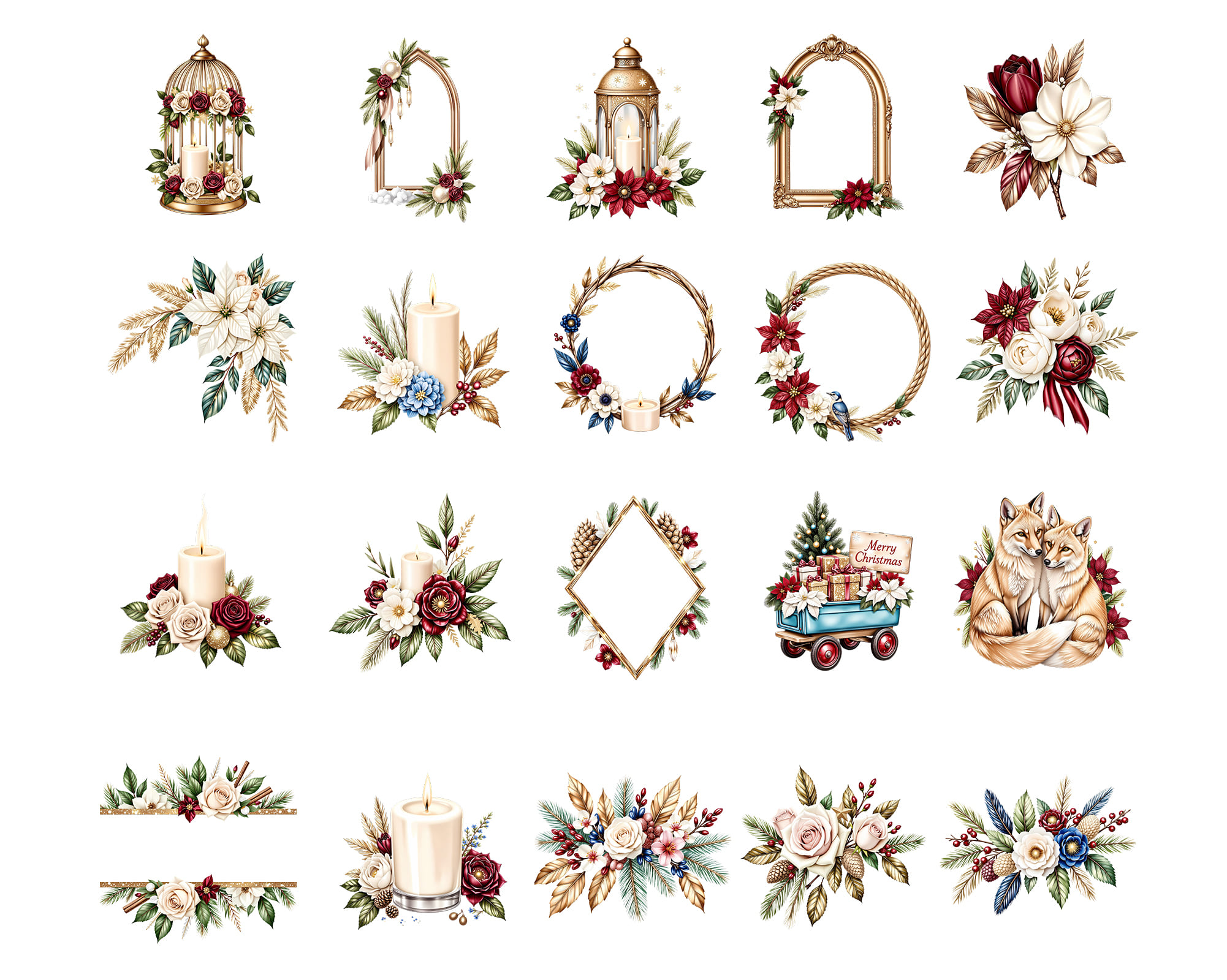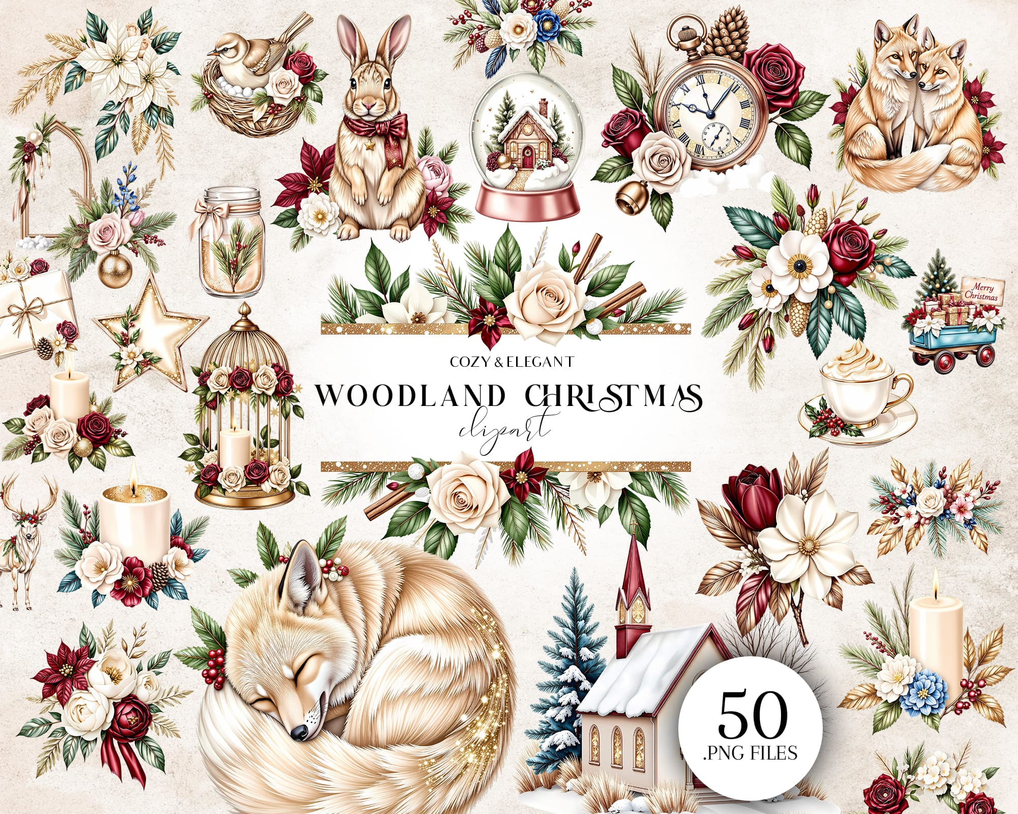 A charming collection of 50 PNG illustrations inspired by woodland Christmas magic. Includes foxes, rabbits, birds, deer, pine cones, floral arrangements, winter cottages, candles, vintage clock, snow globe, cinnamon, berries, poinsettias, greenery and elegant holiday accents.