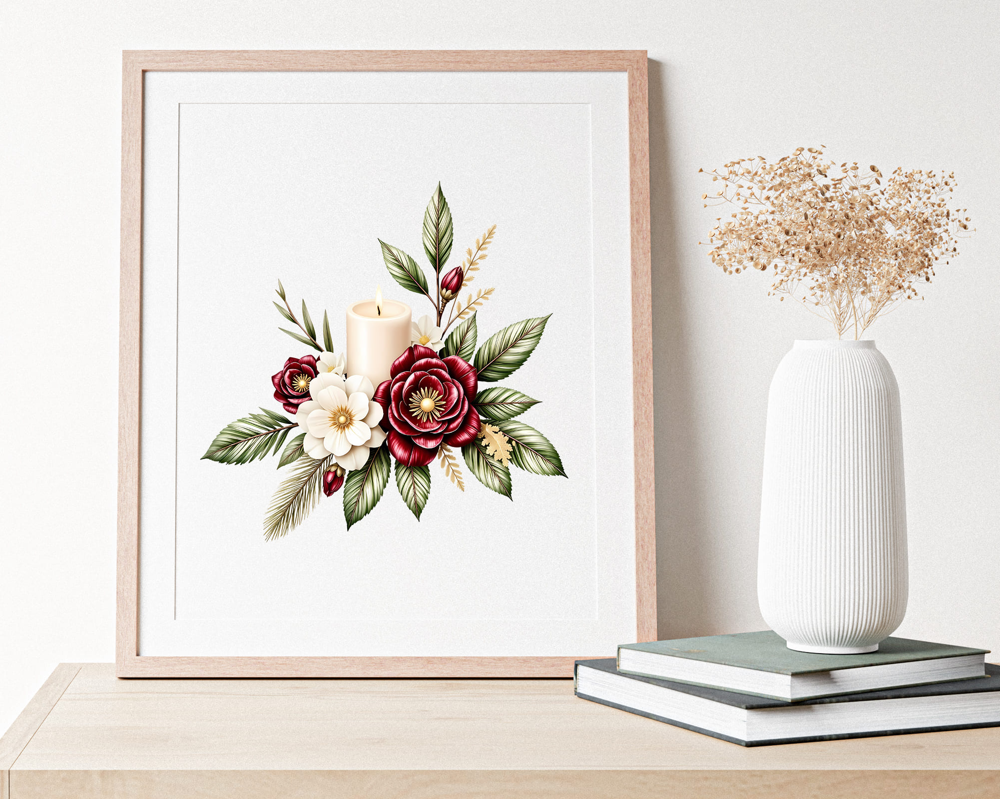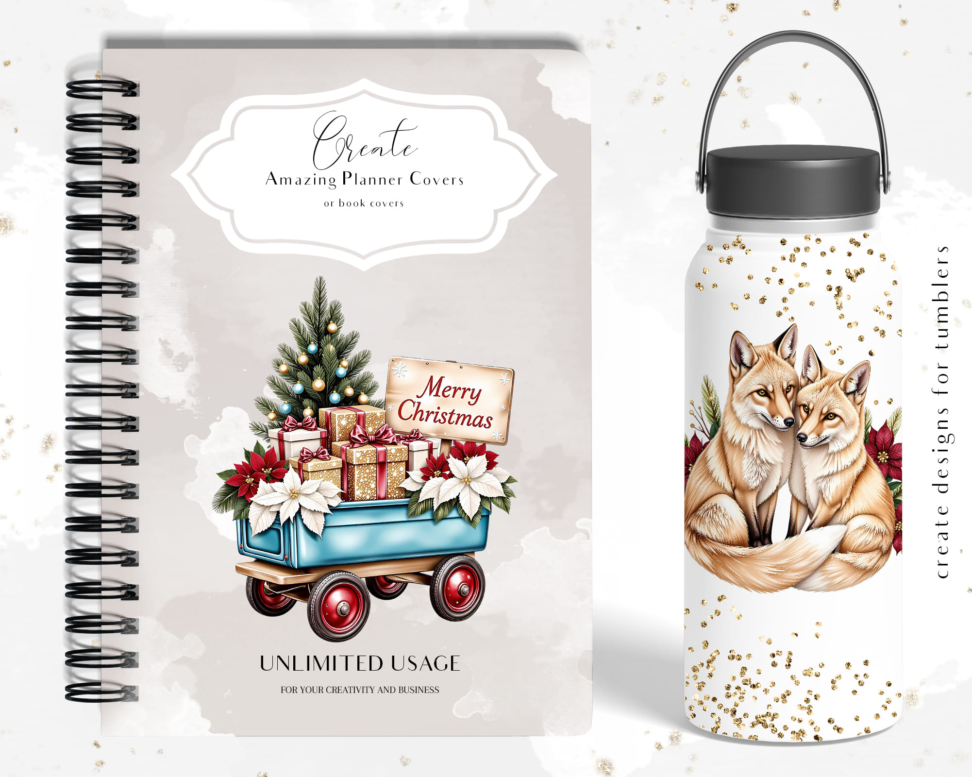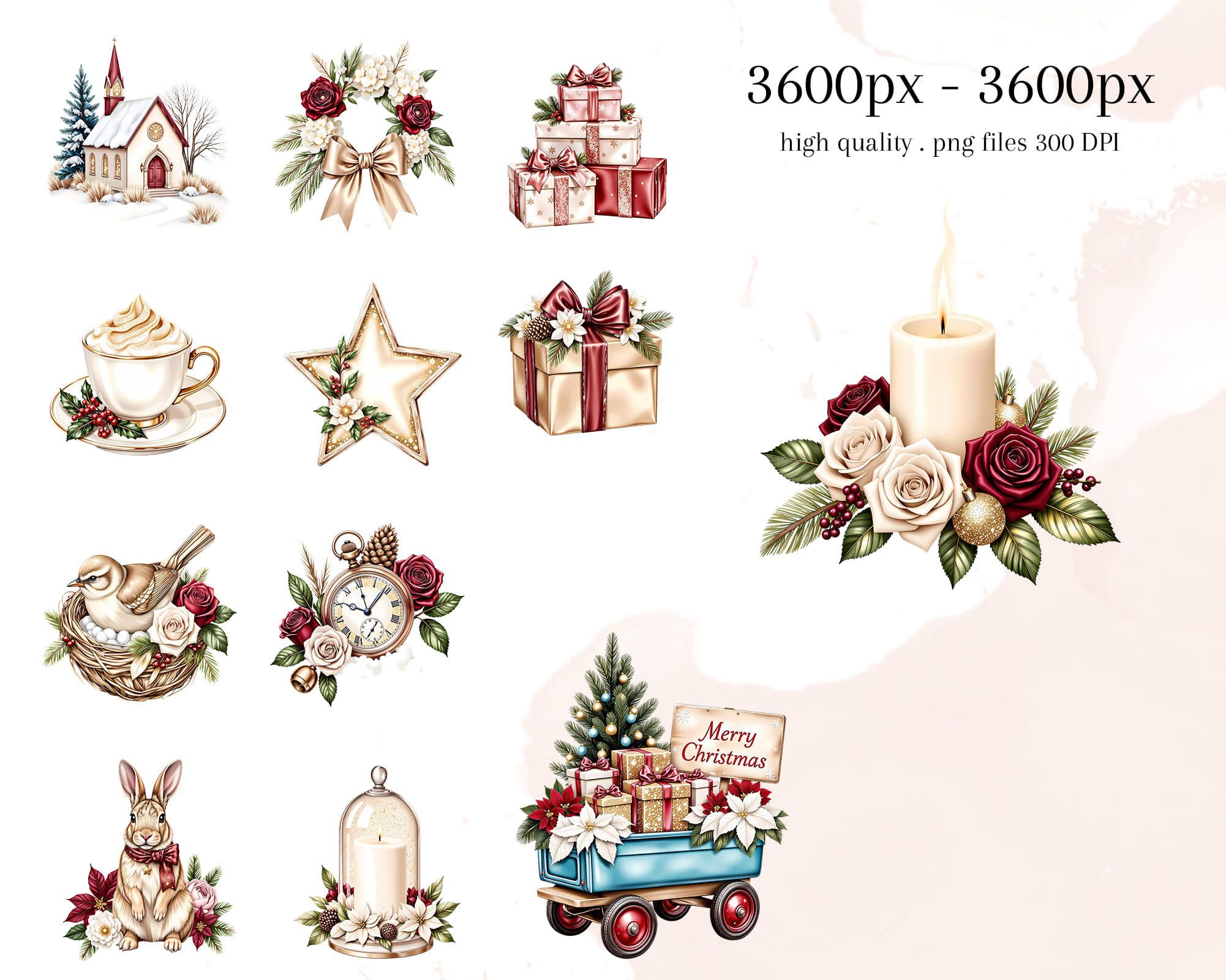 A charming collection of 50 PNG illustrations inspired by woodland Christmas magic. Includes foxes, rabbits, birds, deer, pine cones, floral arrangements, winter cottages, candles, vintage clock, snow globe, cinnamon, berries, poinsettias, greenery and elegant holiday accents.